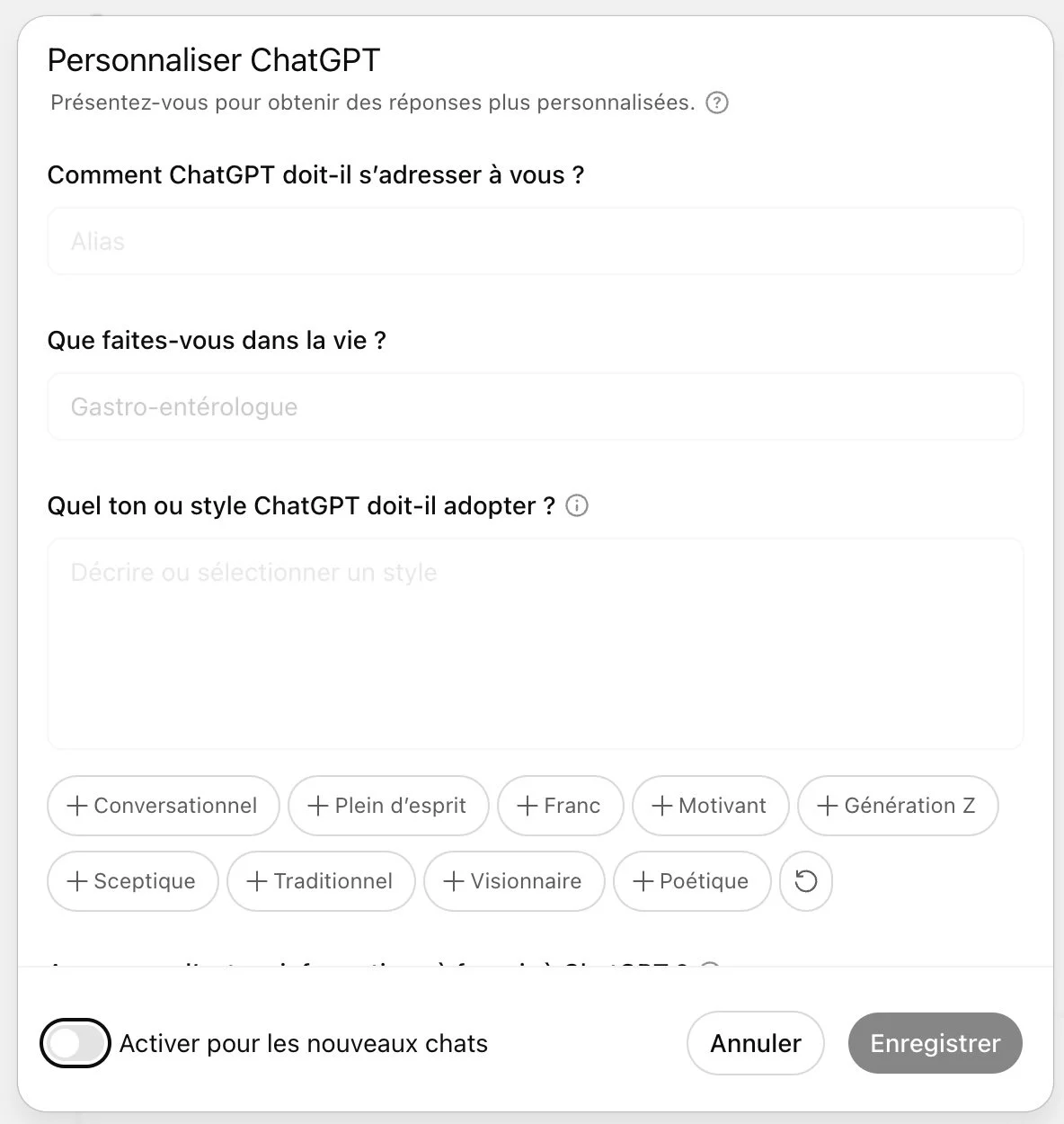 Vous pouvez personnaliser ChatGPT. Vous pouvez dire à ChatGPT comment vous appeler, ce que vous faites, et quels traits il devrait avoir (par exemple, ton amical, ton formel, opiniâtre, réponses courtes).