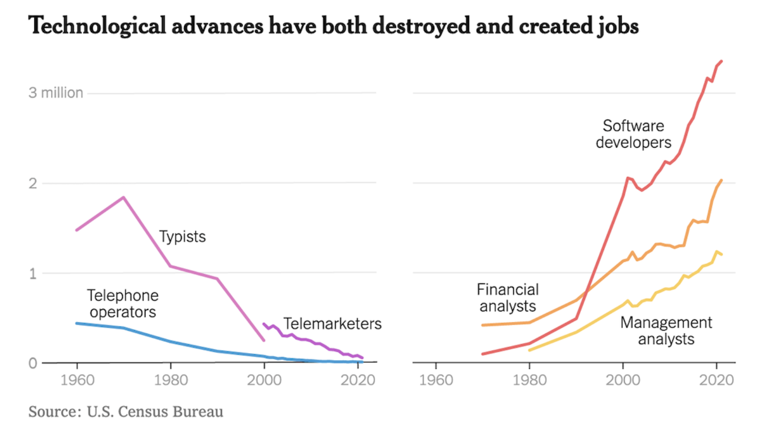 La technologie a toujours fait évolué la manière dont les gens travaillent depuis des décennies, et aussi amélioré la manière dont ils travaillent (ou, à tout le moins, les a rendus plus productifs). Et c’est sans compter toutes les créations d’emploi que l’IA va développer ces prochaines années.