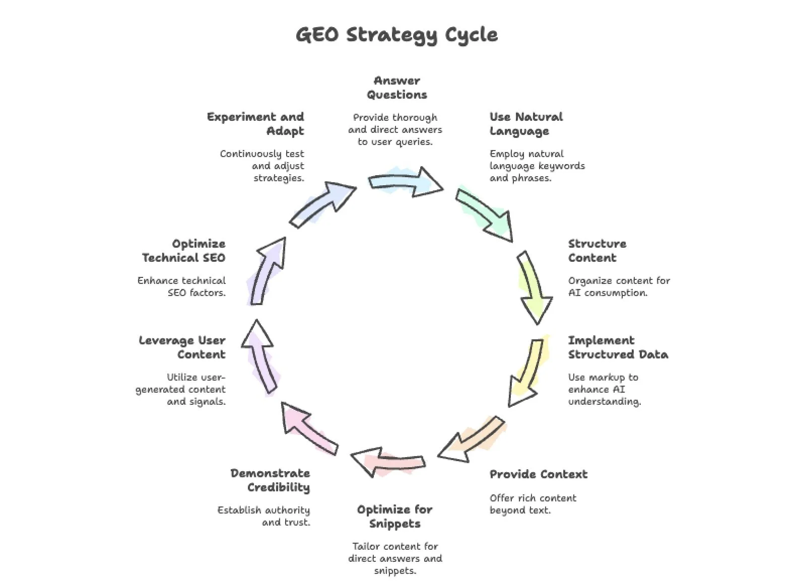 To thrive in this new era of search, marketers and content strategists should embrace GEO by creating high-quality, structured content tailored to the questions their audience asks AI tools. Focus on long-tail and conversational keywords, add schema markup and direct answers in your pages, and ensure your brand’s expertise and unique value are evident across your content. Leverage user-generated content and social signals to bolster credibility, and keep content fresh and up-to-date to remain relevant. At the same time, continue following SEO best practices – fast, crawlable, mobile-friendly site, with authoritative backlinks – as the foundation. Begin monitoring how often and where AIs reference your brand, using emerging tools or manual checks, and adjust your strategy accordingly. Finally, stay forward-looking: experiment with new formats (video, audio, interactive content) since search is becoming multimodal, and be prepared to adapt as AI search evolves. By integrating GEO strategies now, you’ll position your brand to be highly visible in the conversational AI-driven world of search – ensuring that whether a user clicks a link or hears an AI response, they encounter your brand’s knowledge and solutions.